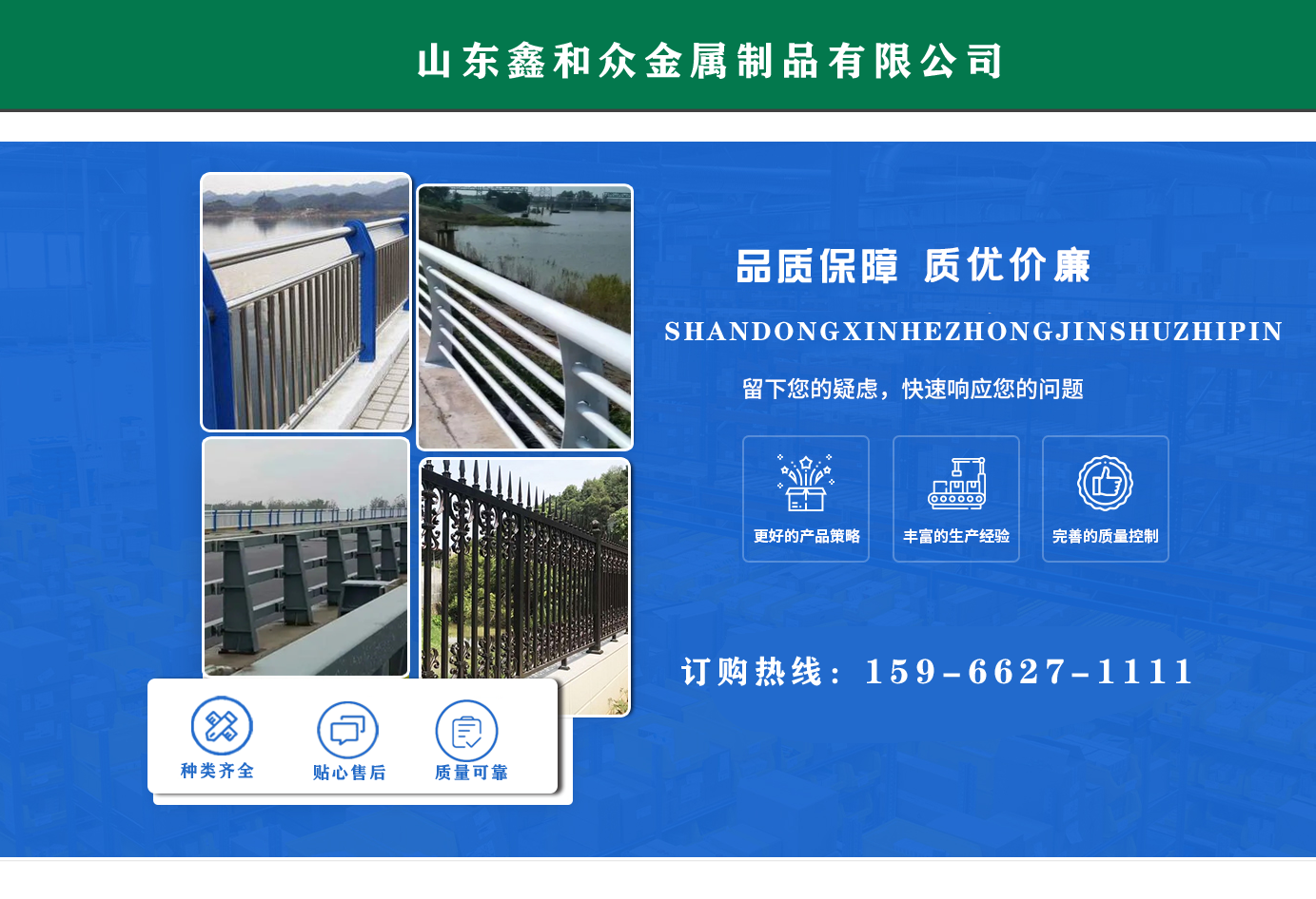 山東鑫和眾金屬制品有限公司主要產(chǎn)品有防撞護欄,橋梁護欄,道路護欄,河道護欄,不銹鋼護欄等護欄。提供設(shè)計方案,一站式定制,包您滿意價格優(yōu)惠,歡迎來電咨詢! 公司常年從事銷售護欄防撞護欄,橋梁護欄,道路護欄,河道護欄,不銹鋼護欄,橋梁鋼護欄,河道燈光護欄等。產(chǎn)品廣泛應(yīng)用于橋梁、河道、旅游景區(qū)、道路、公路、公園、小區(qū)、景觀、道路防撞等領(lǐng)域。 公司產(chǎn)品均采用優(yōu)質(zhì)不銹鋼材料,符合相關(guān)標準。各種型號不銹鋼復(fù)合管及護欄,質(zhì)量嚴格把控。產(chǎn)品強度高、耐腐蝕、焊接牢固、抗沖擊、性能好,防撞護欄結(jié)構(gòu)簡單、美觀實用大方。 歡迎前來訂購!...